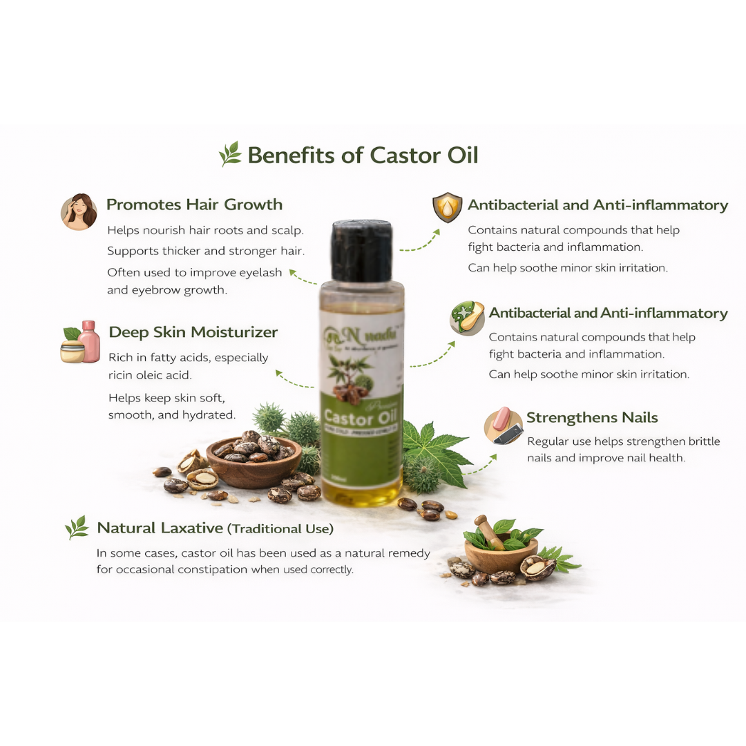 Castor Oil is a pure, natural oil extracted from high-quality castor seeds, traditionally valued for its wide range of wellness and personal care uses. Known for its thick texture and nourishing properties, it is commonly used for hair care, skin care, and massage. This versatile oil supports natural conditioning and is a trusted choice in traditional and Ayurvedic practices.