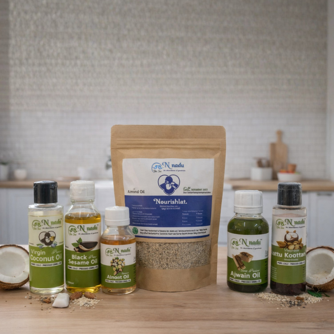 - Includes 7 Natural Products: Almond Oil- 100ml, Virgin Coconut Oil-100ml, Ajwain Oil-50ml, Black Sesame Oil-100ml, Ettukoottam Oil-100ml, Nourishlact-250gm, and Castor Oil-100ml.